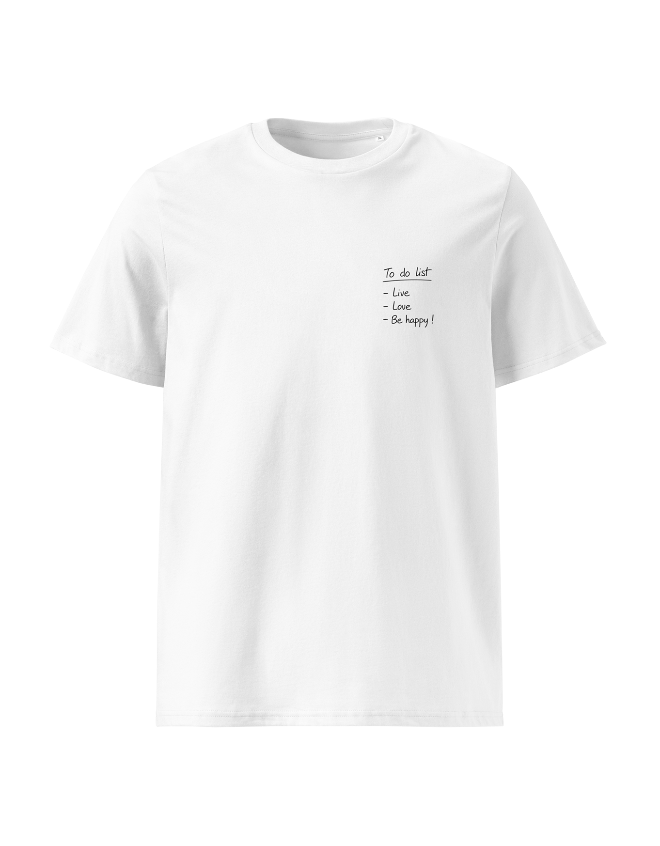 Une to-do list imprimée côté cœur qui remet les priorités à leur place. Le coton épais et doux qui tombe bien, le message qui rappelle que l’essentiel tient en trois lignes. Porter ce t-shirt, c’est choisir de vivre, d’aimer et d’être heureux dans cet ordre.